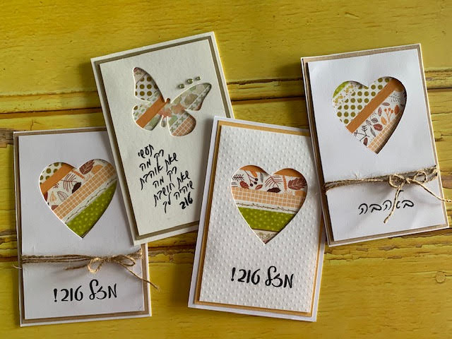 כרטיס עם פתח לב וחותמת  ברכה על קרדסטוק עם טקסטורת נקודות
