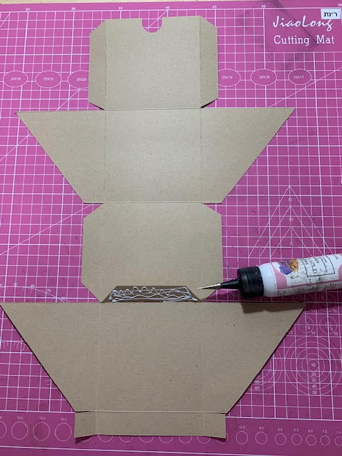 מורחים דבק על הצד הדוגם שתי הכנפיים העליונות ומדביקים אותן את הצלע הישרה של הריבוע העליון.