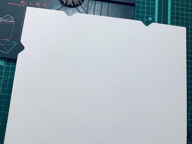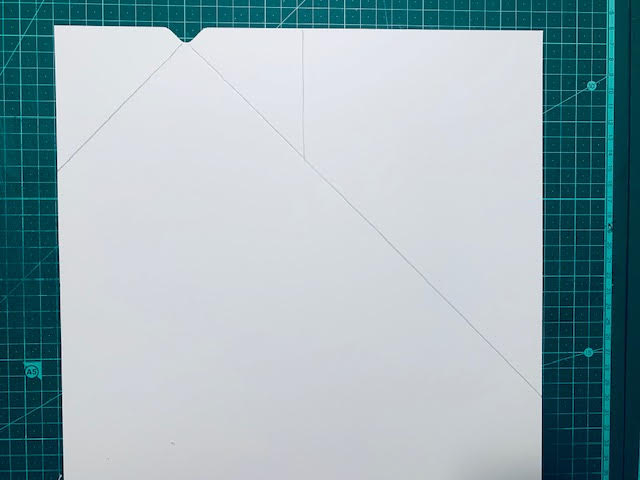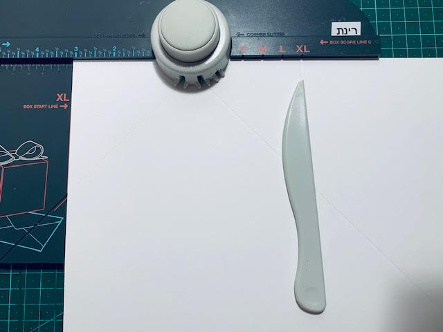 חורצים קו ישר ב XL בצד הימני של הסרגל (עצם הקיפול מצביעה עליו). מגיעים עם החריצה עד נקודת המפגש עם האלכסון בצד ימין.