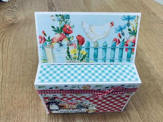 קישטתי להנאתי במדוגמים שנראו לי מתאימים מאוד לקופסת מתכונים, גזרתי אלמנטים מדף המגזרות, החתמתי חותמות וקשרתי סרט שתמיד עושה לי שמח בעיניים.