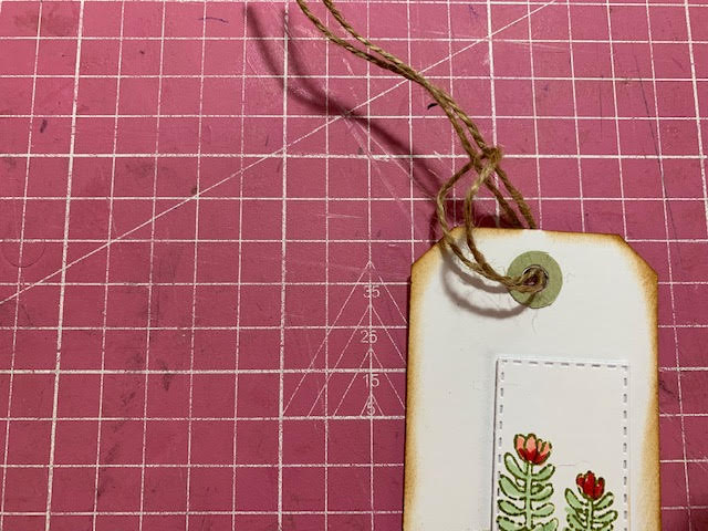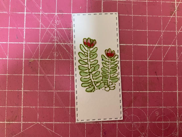 הקקטוסים מוחתמים על תגית ממלבנית עם קווי תפר בגודל