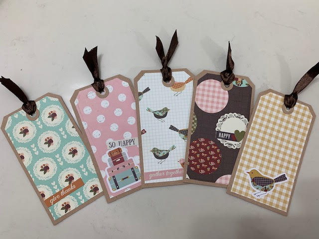 5 תגיות משאריות קארדסטוק ומדוגמים שפנצצתי עם קרופודייל רוטם פינות וחוררתי במחורר. מסביב לחור הדבקתי עיגול שפונצץ בפאנץ עיגול חיזוק חורים שאני מוצאת שהוא מוסיף הרבה שיק.